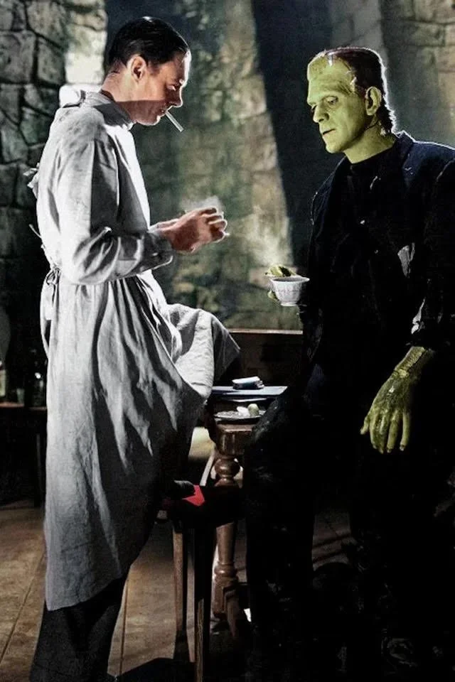 Frankenstein 1931: Mykal brought the iconic behind the scenes image to a modern visualization. Colin Clive and Boris Karloff spend some downtime between scenes, 1931.